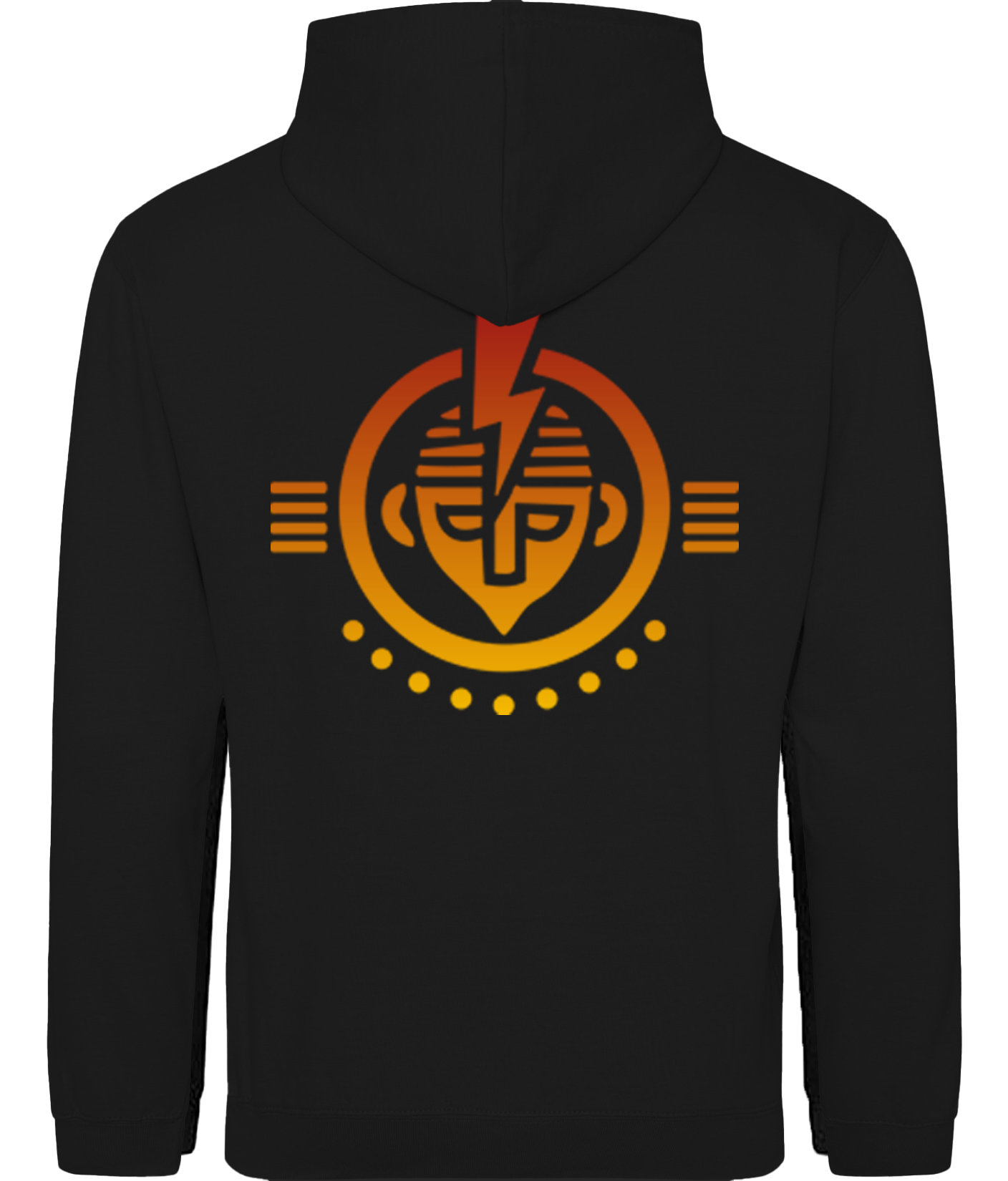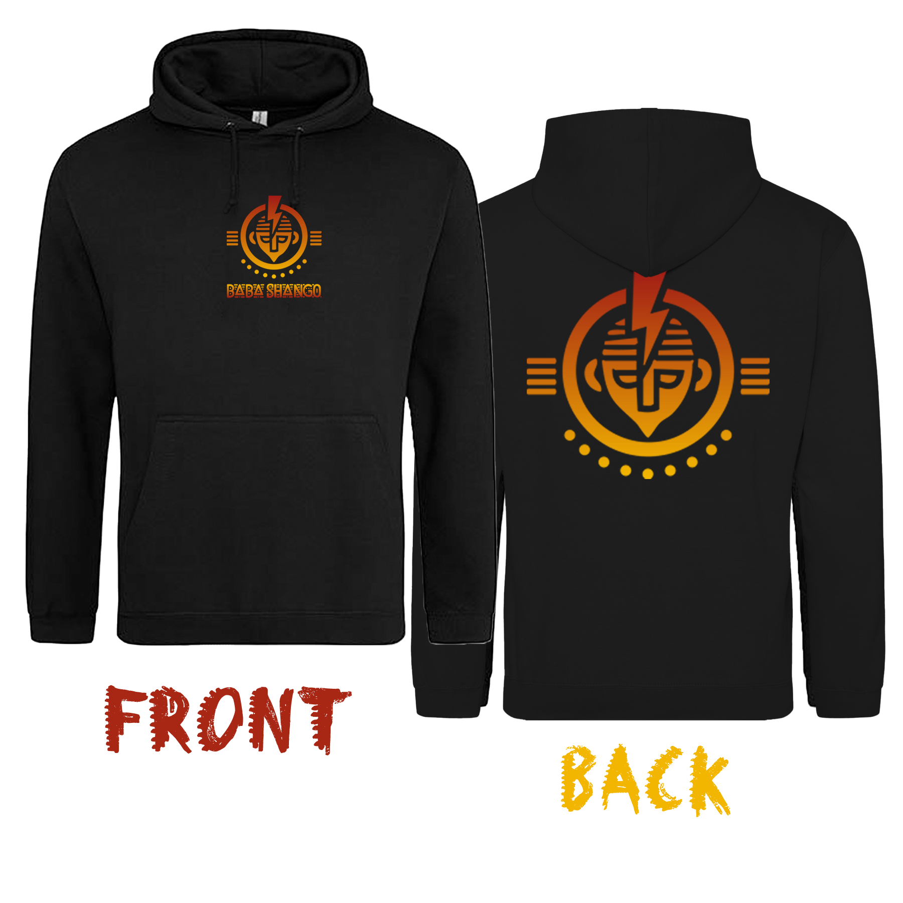 Auf der Vorder- und Rückseite befindet sich das charakteristische Babashango-Logo: ein stilisierter Shamanenkopf, umrahmt von dynamischen Linien und einem kraftvollen Blitzsymbol. Die warmen Farben in Rot- und Orangetönen setzen einen starken Akzent auf dem schwarzen Stoff und sorgen für einen besonderen Look, der sofort ins Auge fällt.