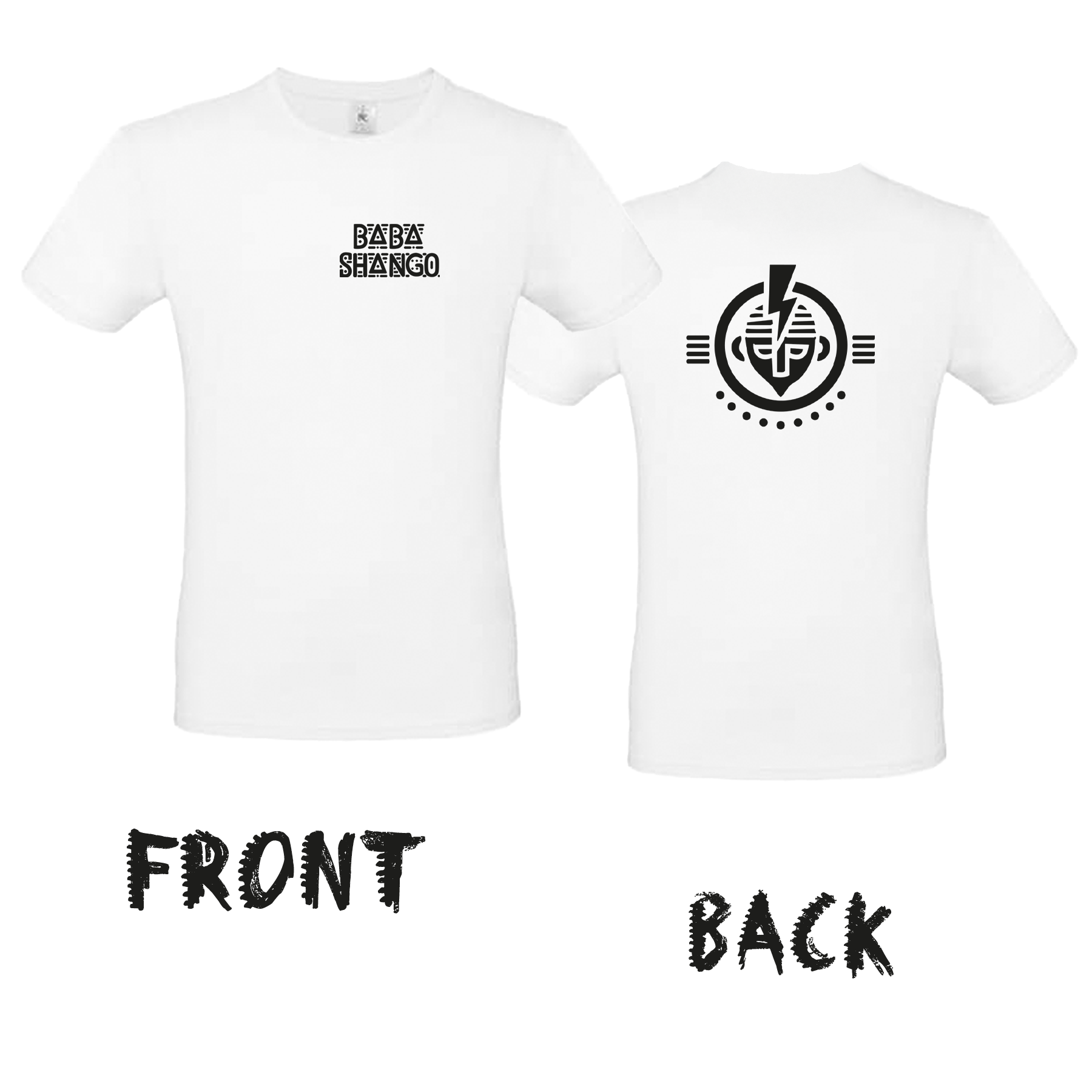 Vorne befindet sich der BABA SHANGO Schriftzug in markanter Tribal-Optik. Auf der Rückseite prangt das große, ikonische Shamanenkopf-Logo in tiefem Schwarz – kraftvoll, mystisch und unübersehbar. Die starke Schwarz-Weiß-Kombination macht das Shirt zu einem echten Statement-Piece.