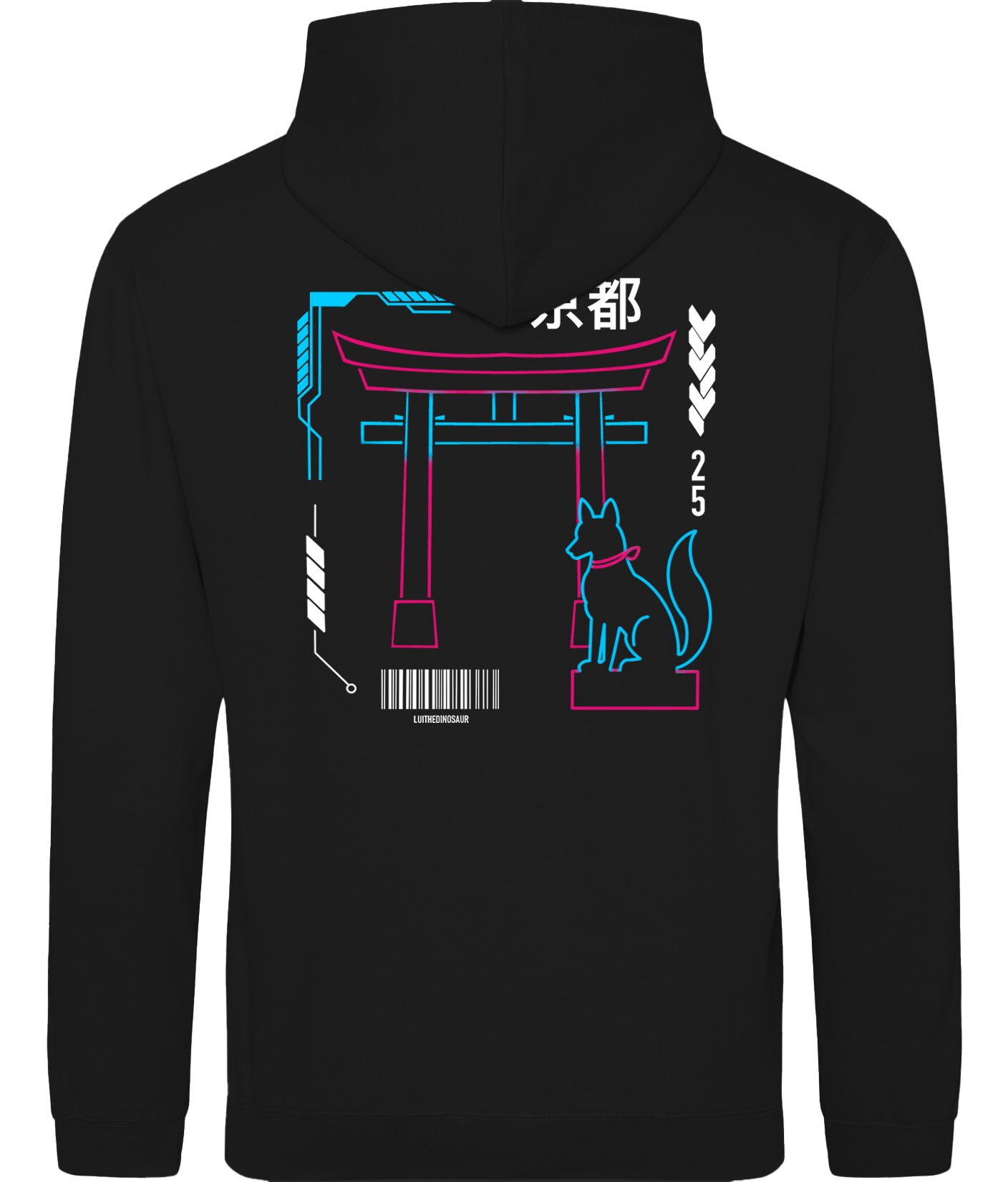 Dieses Shirt bringt urbane Neon-Vibes nach Kyoto: Auf der Vorderseite ein stilisierter Fuchs in kräftigen Blau- und Pinktönen, auf der Rückseite das komplette Design mit japanischem Tempel, Fuchs und dem Schriftzug „京都“ (= Kyoto). Ein modernes Motiv mit traditionellem Flair – exklusiv von Lui selbst entworfen.