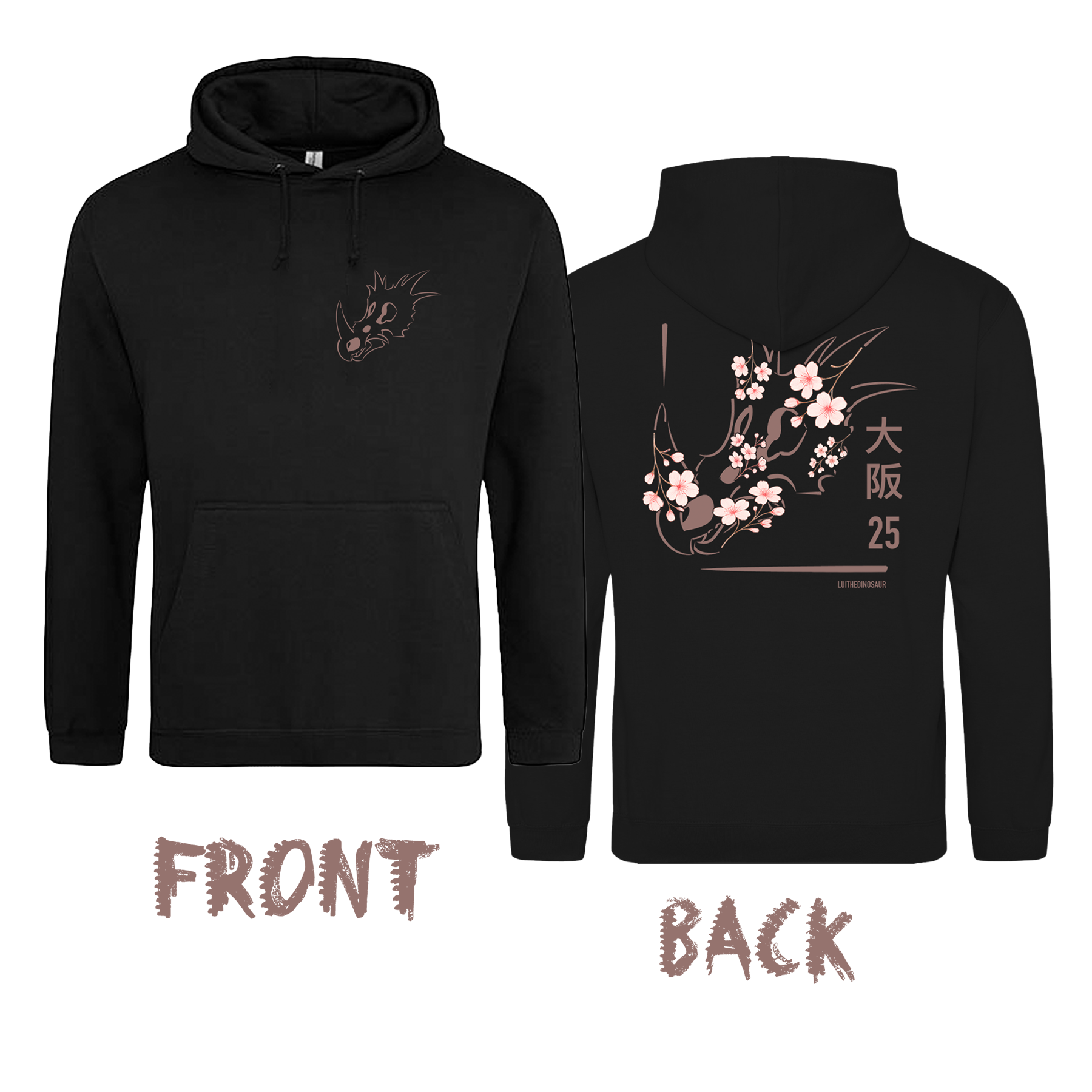 Dieses Shirt vereint die Stärke des Styracosaurus mit der Eleganz japanischer Kirschblüten. Das von Lui selbst entworfene Design zeigt auf der Vorderseite einen minimalistischen Styraco-Kopf und auf der Rückseite ein großes Osaka-Motiv mit Blüten und japanischen Schriftzeichen („大阪“ = Osaka).