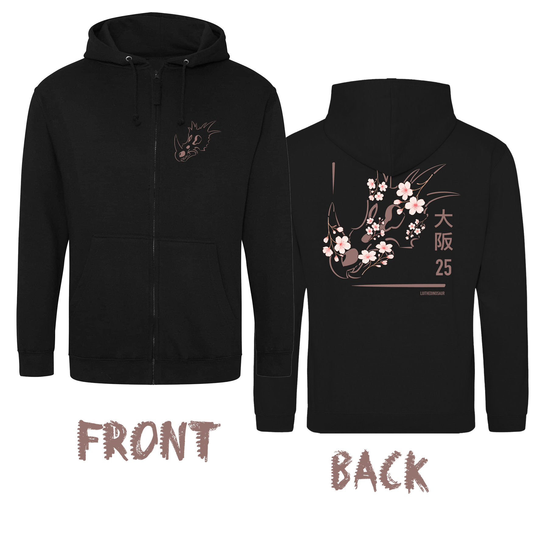 Dieses Shirt vereint die Stärke des Styracosaurus mit der Eleganz japanischer Kirschblüten. Das von Lui selbst entworfene Design zeigt auf der Vorderseite einen minimalistischen Styraco-Kopf und auf der Rückseite ein großes Osaka-Motiv mit Blüten und japanischen Schriftzeichen („大阪“ = Osaka).