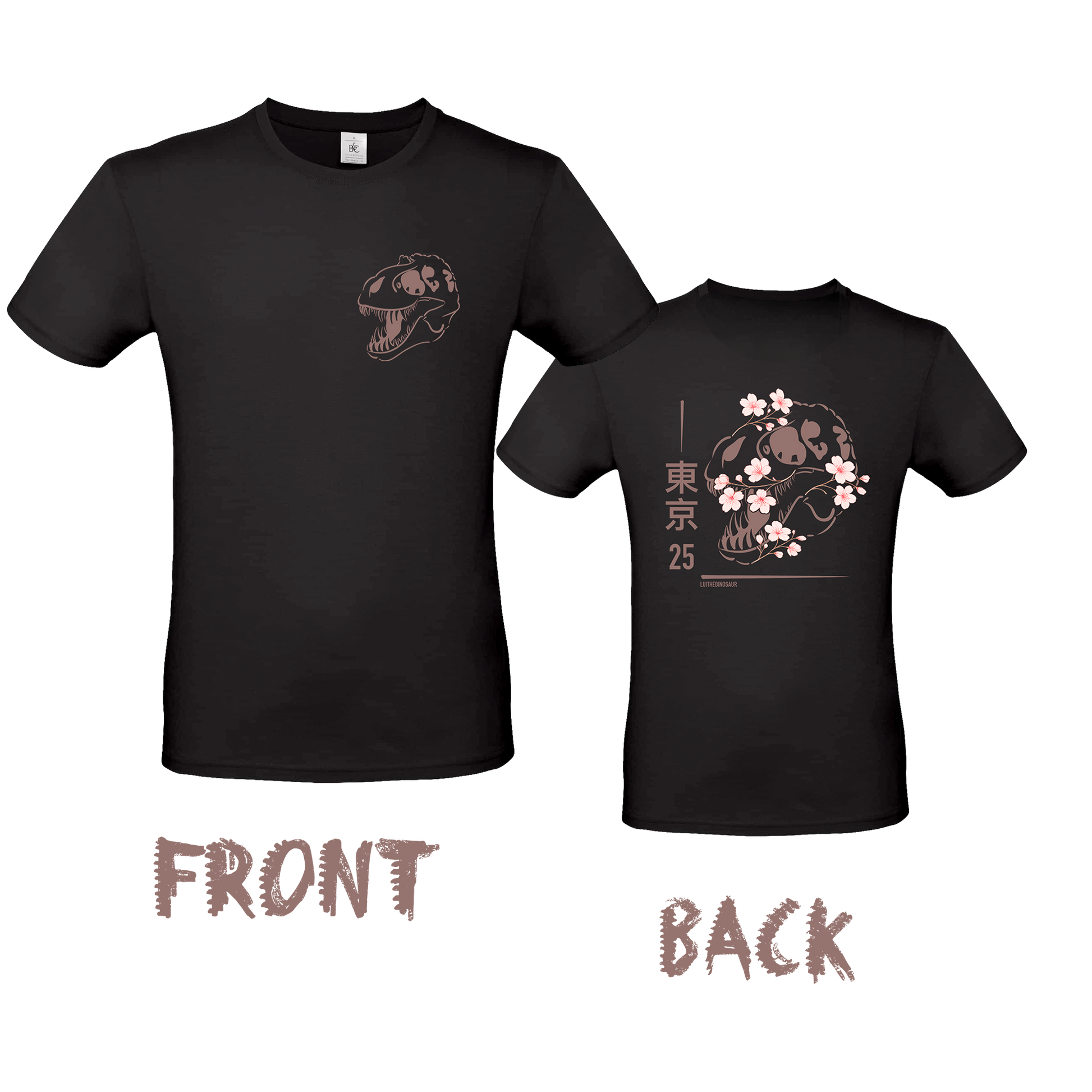 Der Schädel eines T-Rex kombiniert mit filigranen Kirschblüten und japanischen Schriftzeichen („東京“ = Tokyo). Das Motiv wurde von Lui selbst entworfen und macht dieses Shirt zu einem absoluten Must-have.